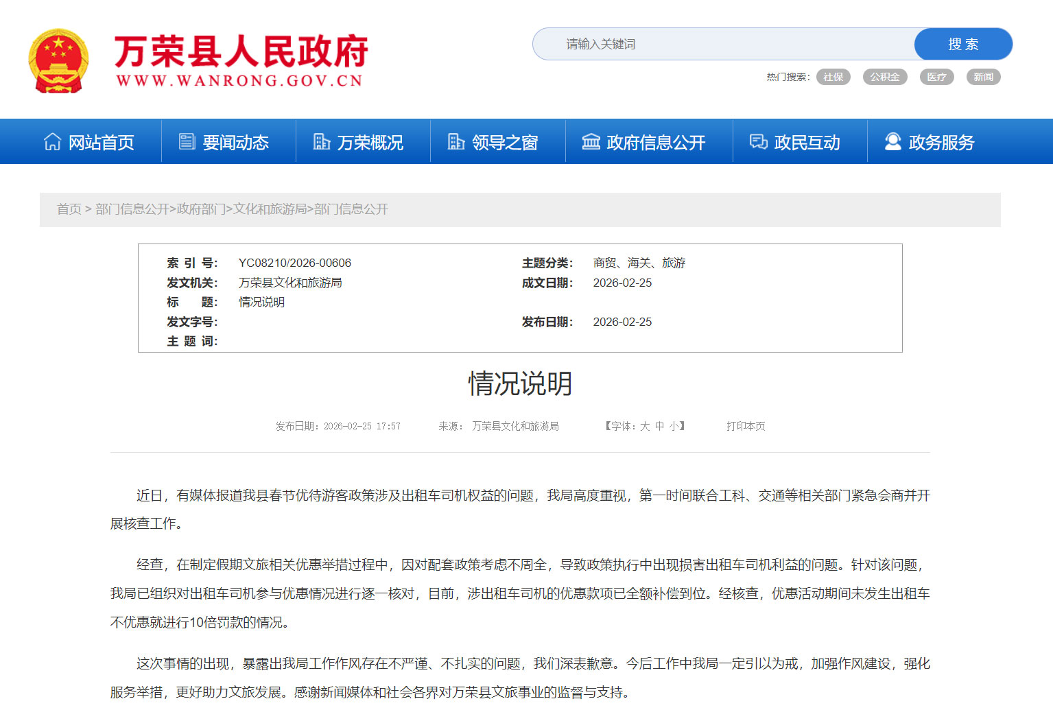 山西省万荣县通报“春节优待游客政策涉及出租车司机权益问题”