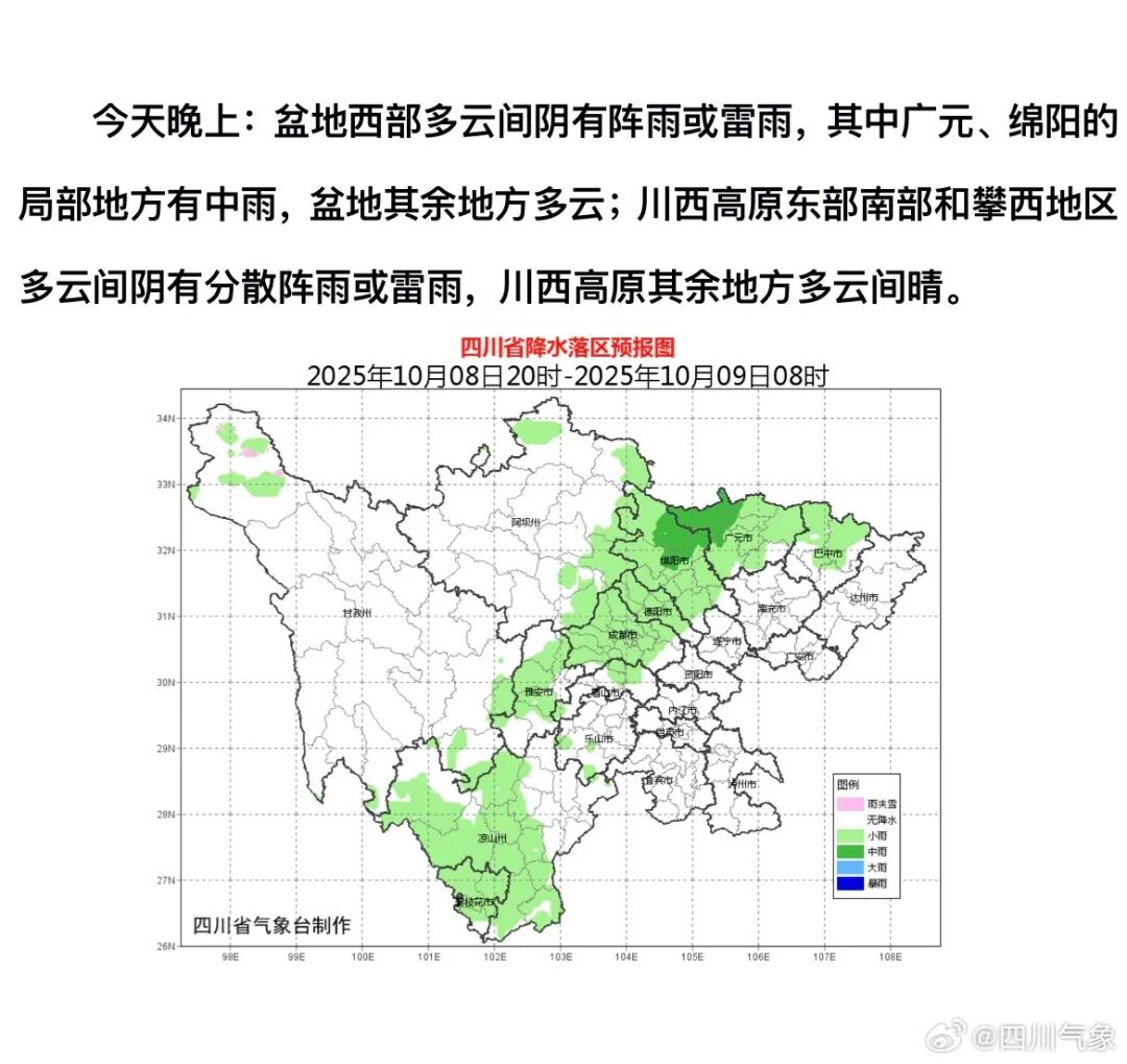 其中,今天(8日)白天到晚上:盆地西部北部阴天间多云有阵雨或雷雨,其中广元、绵阳的部分地方有中到大雨,盆地其余地方多云;川西高原多云间阴,东部南部有分散阵雨或雷雨;攀西地区阴天间多云有分散阵雨或雷雨,局地有中雨。24小时内,盆地最低气温:19~22℃;最高气温:西部24~27℃,其余地方29~32℃。