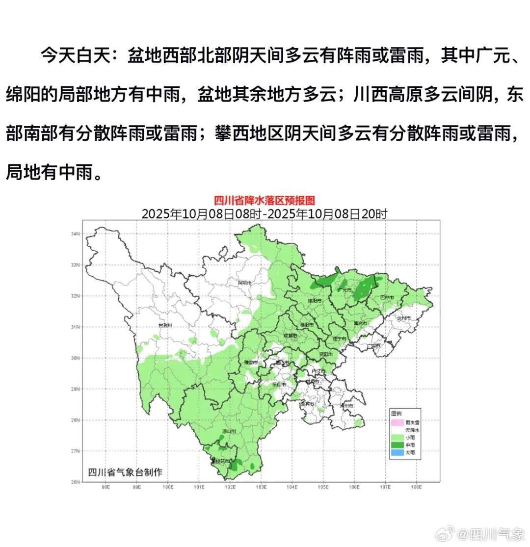 记者从四川省气象台了解到,未来三天,盆地西部北部多阵雨或小雨,局部地方有中到大雨;川西高原和攀西地区多分散阵雨,8日攀西地区南部有中到大雨。局部地方累积雨量较大,需加强防范地质灾害、中小河流山洪等气象次生灾害。