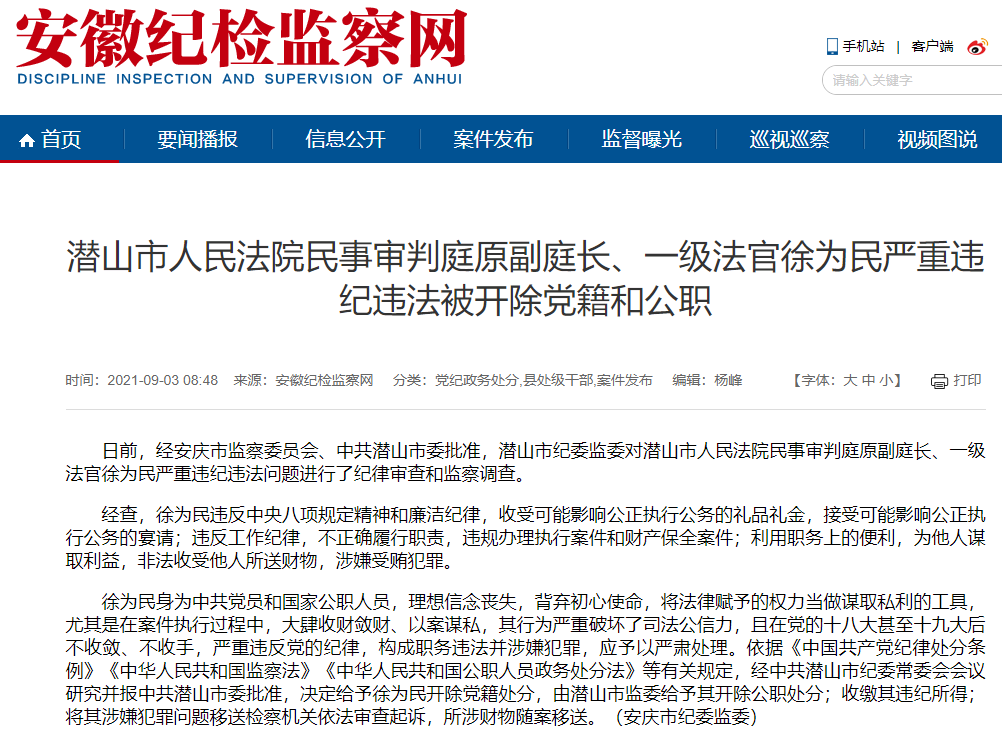 新安晚报 安徽网 大皖新闻讯 据安徽纪检监察网消息:日前,经安庆市监察委员会、中共潜山市委批准,潜山市纪委监委对潜山市人民法院民事审判庭原副庭长、一级法官徐为民严重违纪违法问题进行了纪律审查和监察调查。