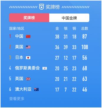 东京奥运还剩最后一天,拥有38枚金牌的中国队仍然占据金牌榜榜首,排名第二的美国队金牌数追至36枚,日本队27金位居第三。