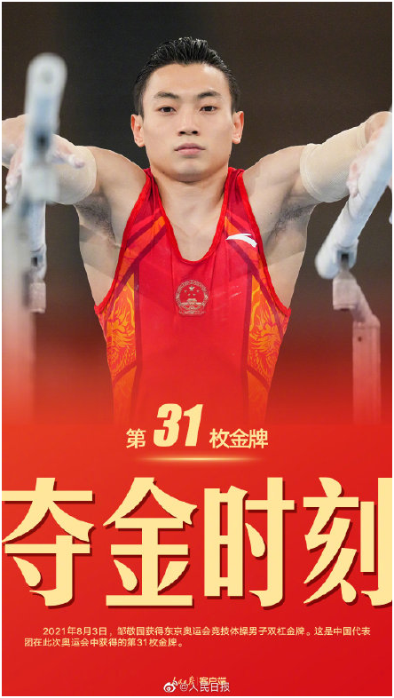 31金——邹敬园夺得体操男子双杠金牌