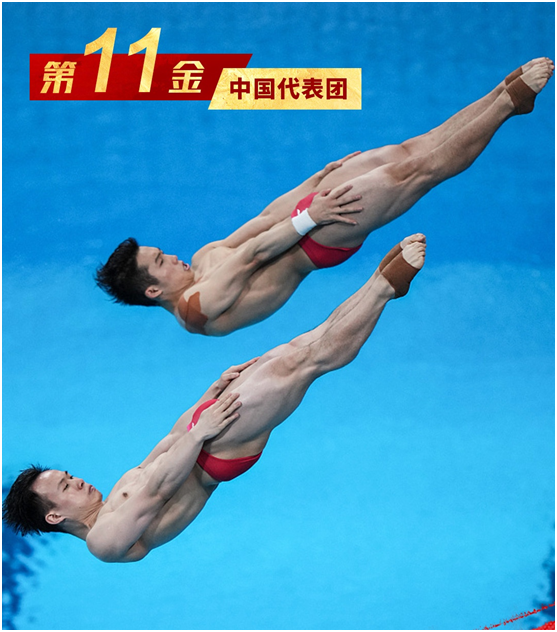 7月28日,东京奥运会男子双人3米跳板跳水决赛中,中国组合王宗源/谢思埸一路领先,为中国跳水队夺得本届奥运会的第三块跳水金牌,这也是中国代表团在本届奥运会的第11块金牌!同时,中国队在此项目上实现了4届3冠的伟业!恭喜,中国梦之队!