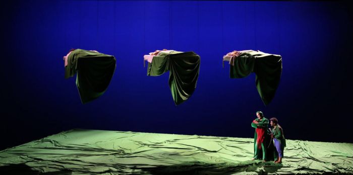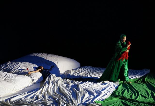 “舞台上一张巨大的床取代了杂乱的树林,绿色的床和蓝色背景,一副‘以天为被地为床’的感觉,仙后身穿神秘的蓝色,仙王则是嫉妒的绿色,简洁却充满暗示。两对恋人从洁白的衣衫,到被魔药迷惑衣服上沾染了绿色,再到最后梦醒时分重回白色,当绿色的舞台整个升起时,我们回到了一片纯净而圆满的世界。”