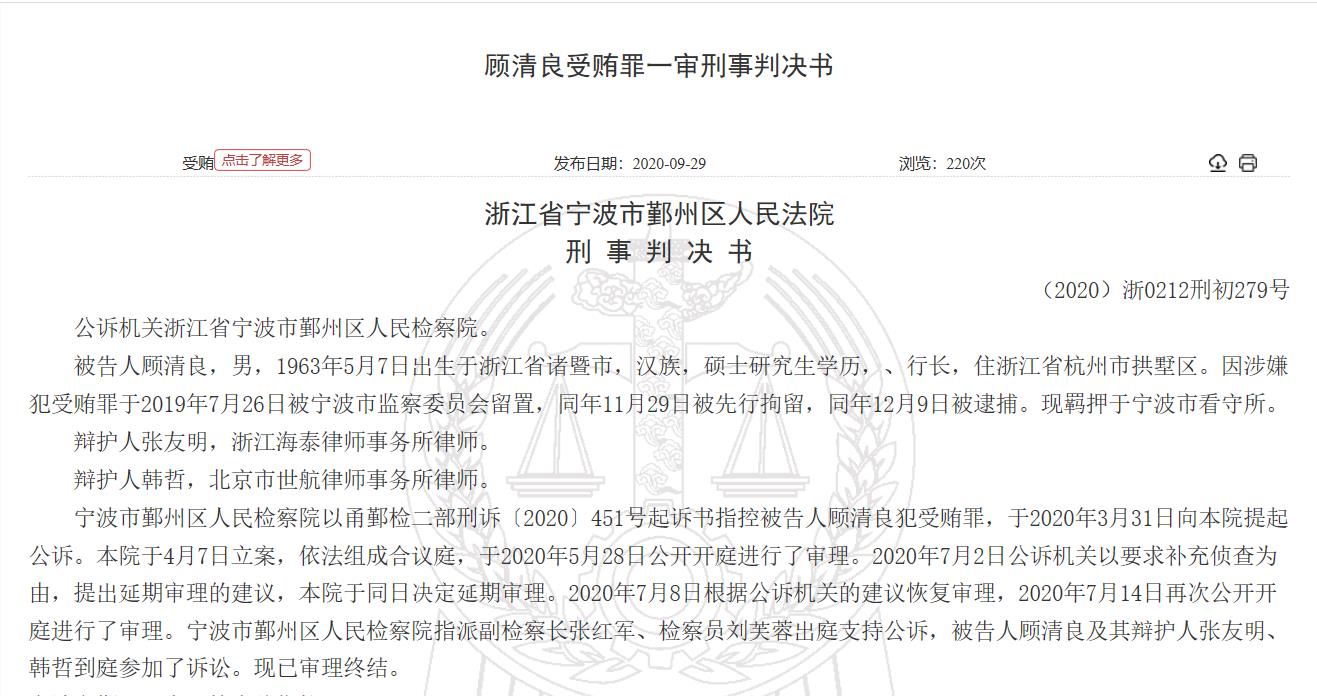 判决书显示,顾清良因涉嫌犯受贿罪于2019年7月26日被宁波市监察委员会留置,同年11月29日被先行拘留,同年12月9日被逮捕。