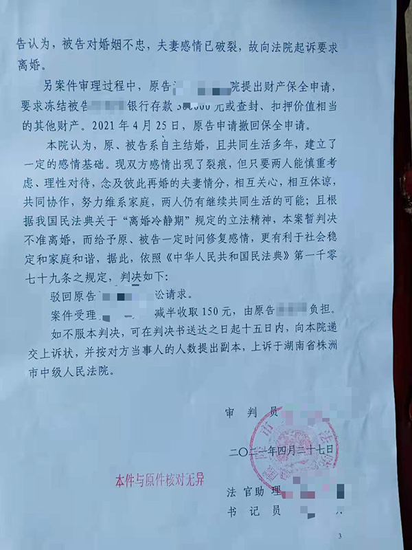 汤先生向澎湃新闻提供的民事判决书显示,醴陵市法院认为,原、被告系自主结婚,且共同生活多年,建立了一定的感情基础。现双方感情出现了裂痕,但只要两人能慎重考虑、理性对待,念及彼此再婚的夫妻情分,相互关心,相互体谅,共同协作,努力维系家庭,两人仍有继续共同生活的可能;且根据我国民法典关于“离婚冷静期”规定的立法精神,本案暂判决不准离婚,而给予原、被告一定时间修复感情,更有利于社会稳定和家庭和谐。据此,依照《中华人民共和国民法典》相关规定,驳回原告汤先生的诉讼请求,案件受理费减半收取由原告承担。