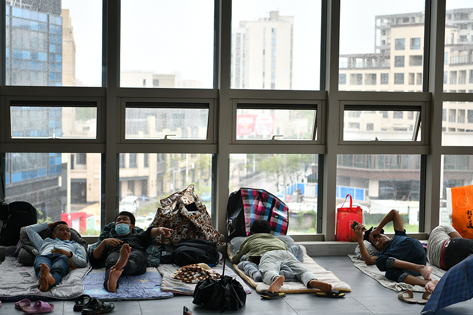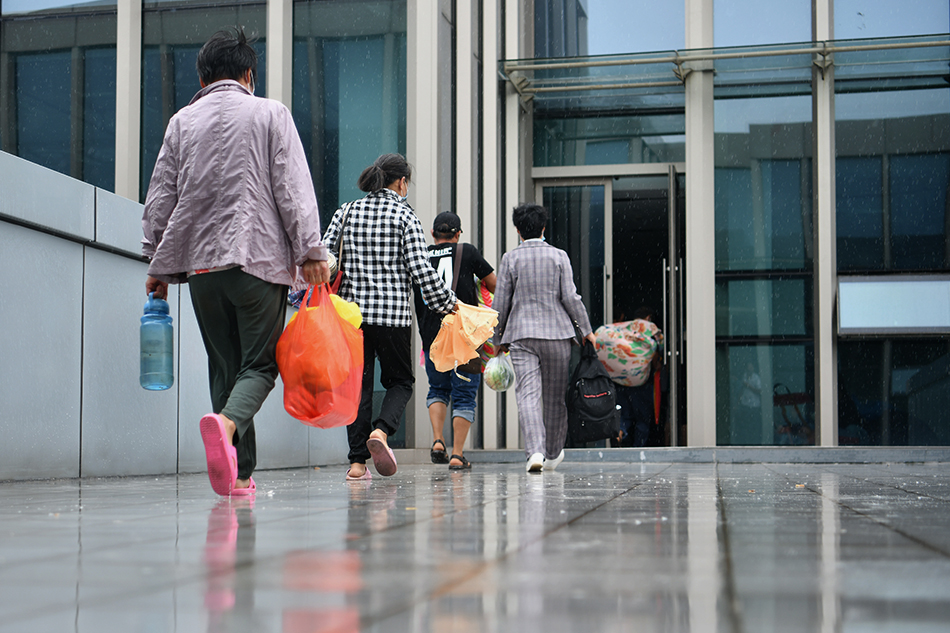 2021年9月13日,上海,建设工人有序地转移到安置点内。