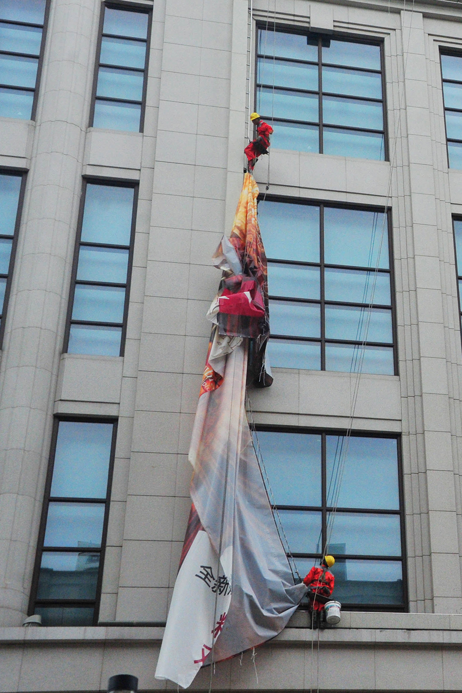 2021年9月12日,上海,工人将拆下的悬挂式大型广告卷起。