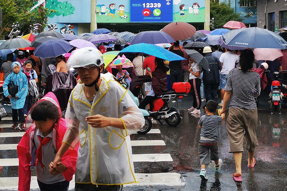 2021年9月13日早晨,受台风灿都影响,申城降下小雨,学生冒雨上学。