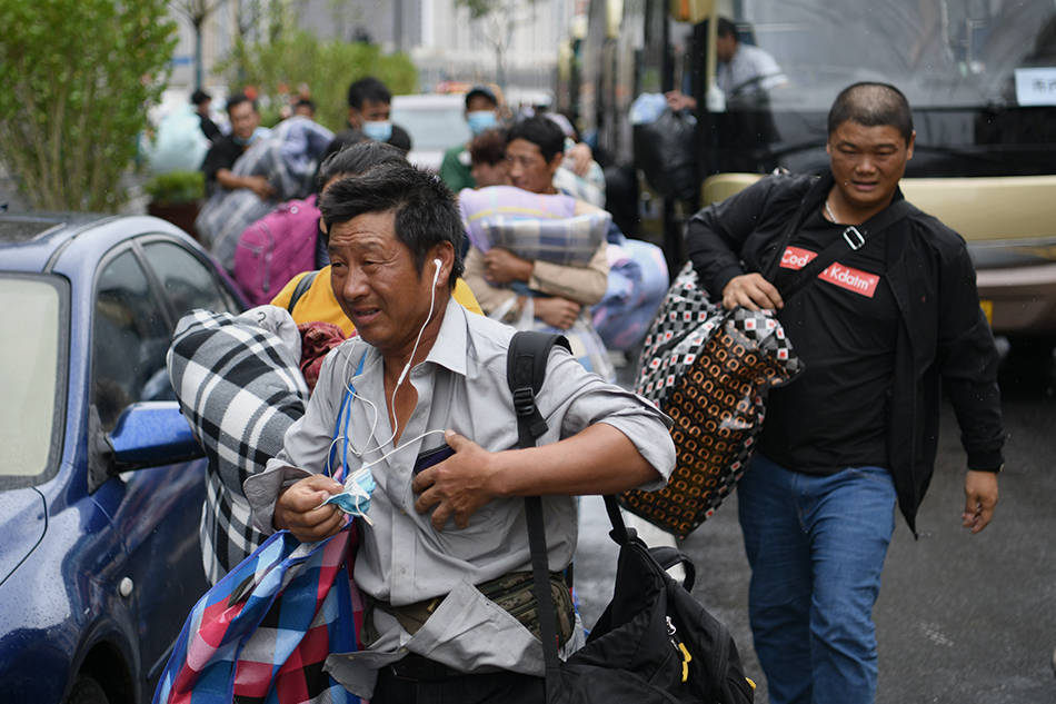 2021年9月13日,上海,住在临港建设者小镇的建设工人,有序地转移到安置点内。