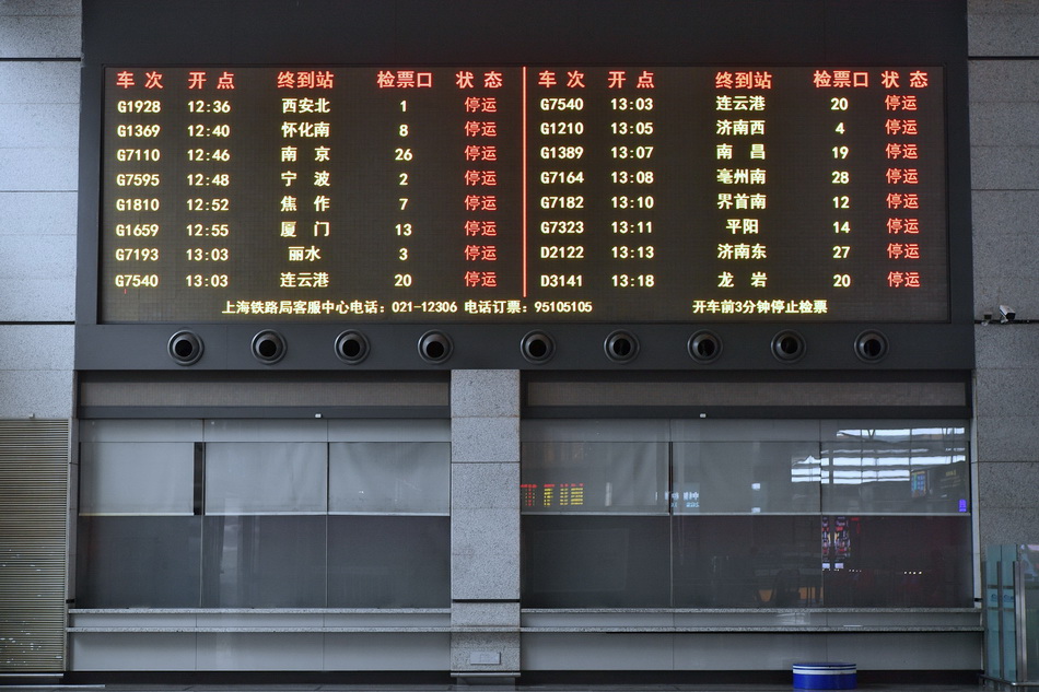 2021年9月13日,受“灿都”影响上海高铁大面积停运。虹桥火车站内的售票口已关闭,液晶屏滚动着各车次状态。