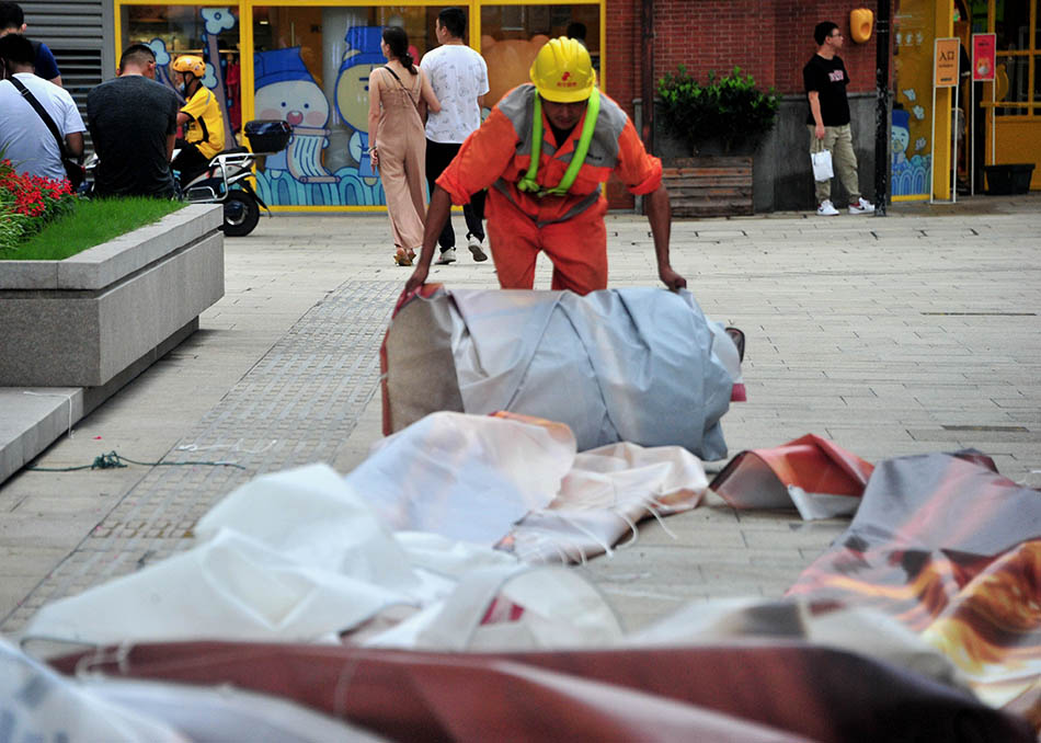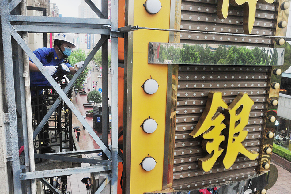 受“灿都”外围影响,2021年9月12日下午起,上海风力逐步增强,黄浦南京路步行街城管部门对沿街户外广告牌进行逐一进行巡查,同时对支马路的店招店牌展开排查,严防坠落的安全事故发生。