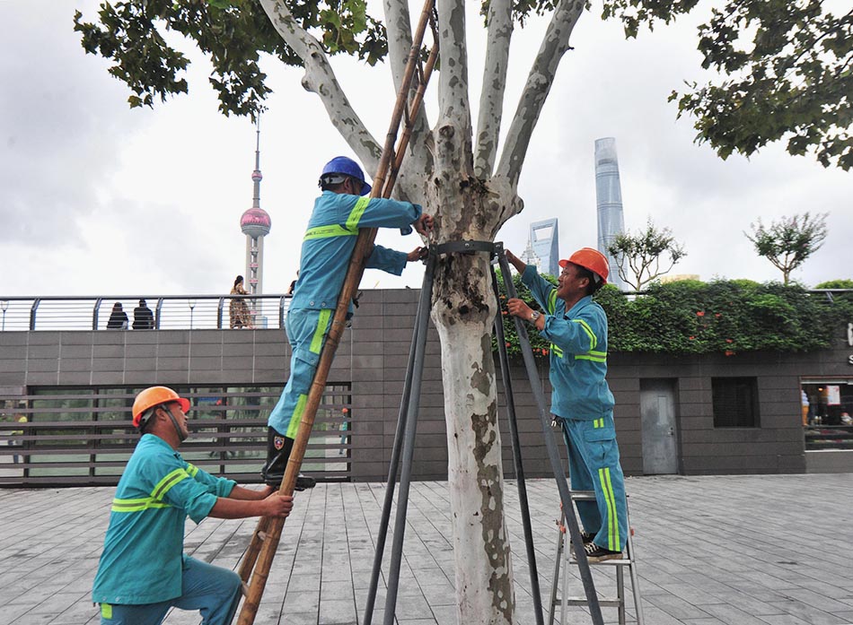 2021年9月12日,“灿都”外围开始影响上海,外滩风景区沿江的风力明显增大。园林绿化工人加固中山东一路沿线的绿化树木支撑,防止减少发生倒伏现象。