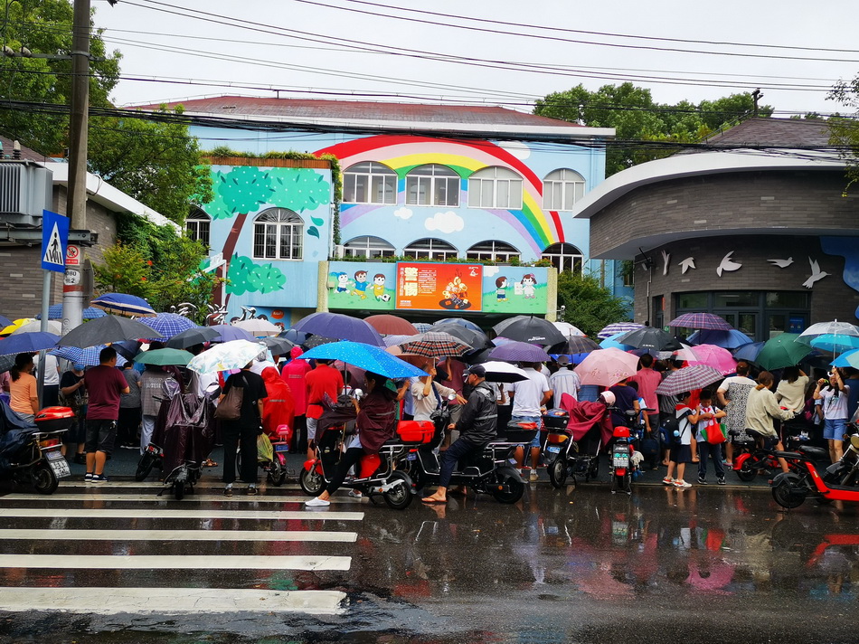 2021年9月13日12时许,上海莘北路一小学门口站满了接学生放学的家长。