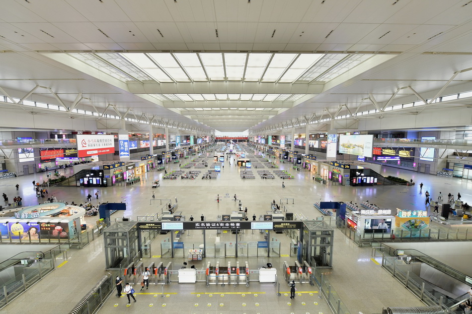 2021年9月13日,受台风“灿都”影响,上海高铁大面积停运,虹桥火车站异常冷清。