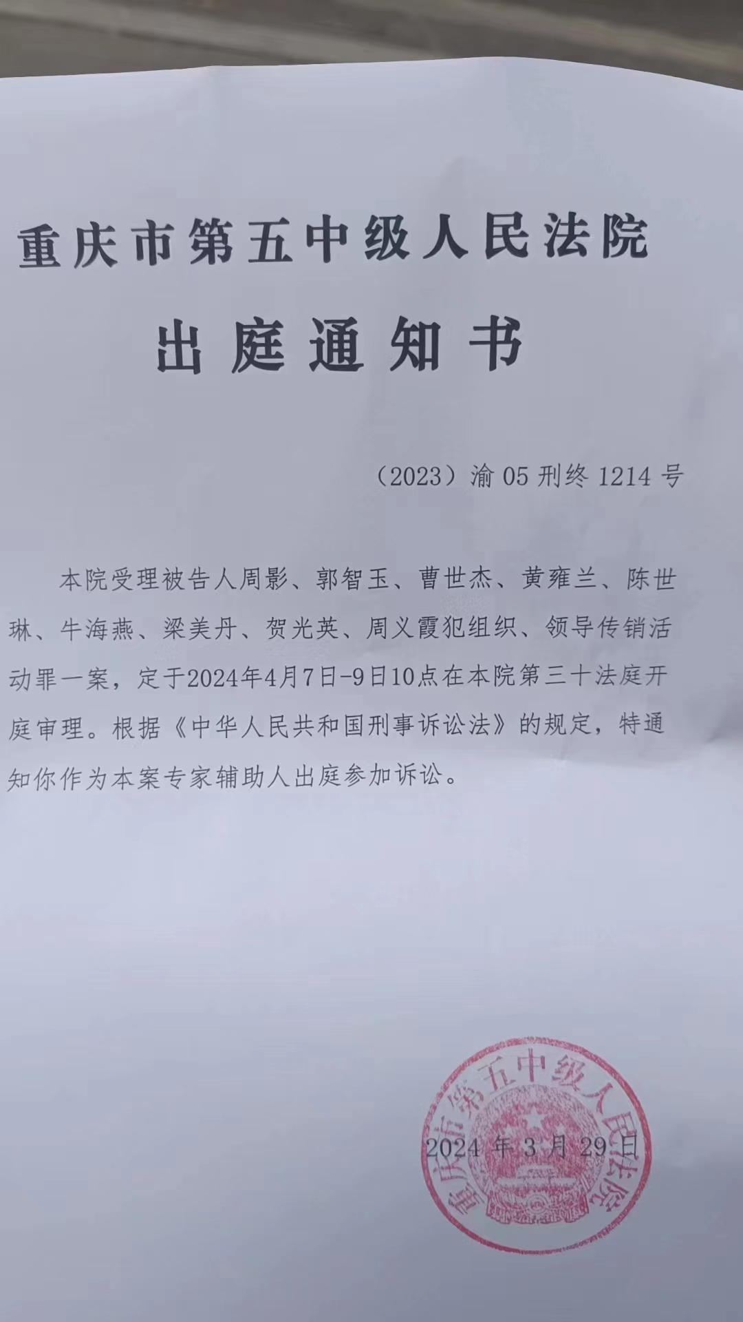 重庆市五中院通知黄永洪作为专家辅助人出庭。