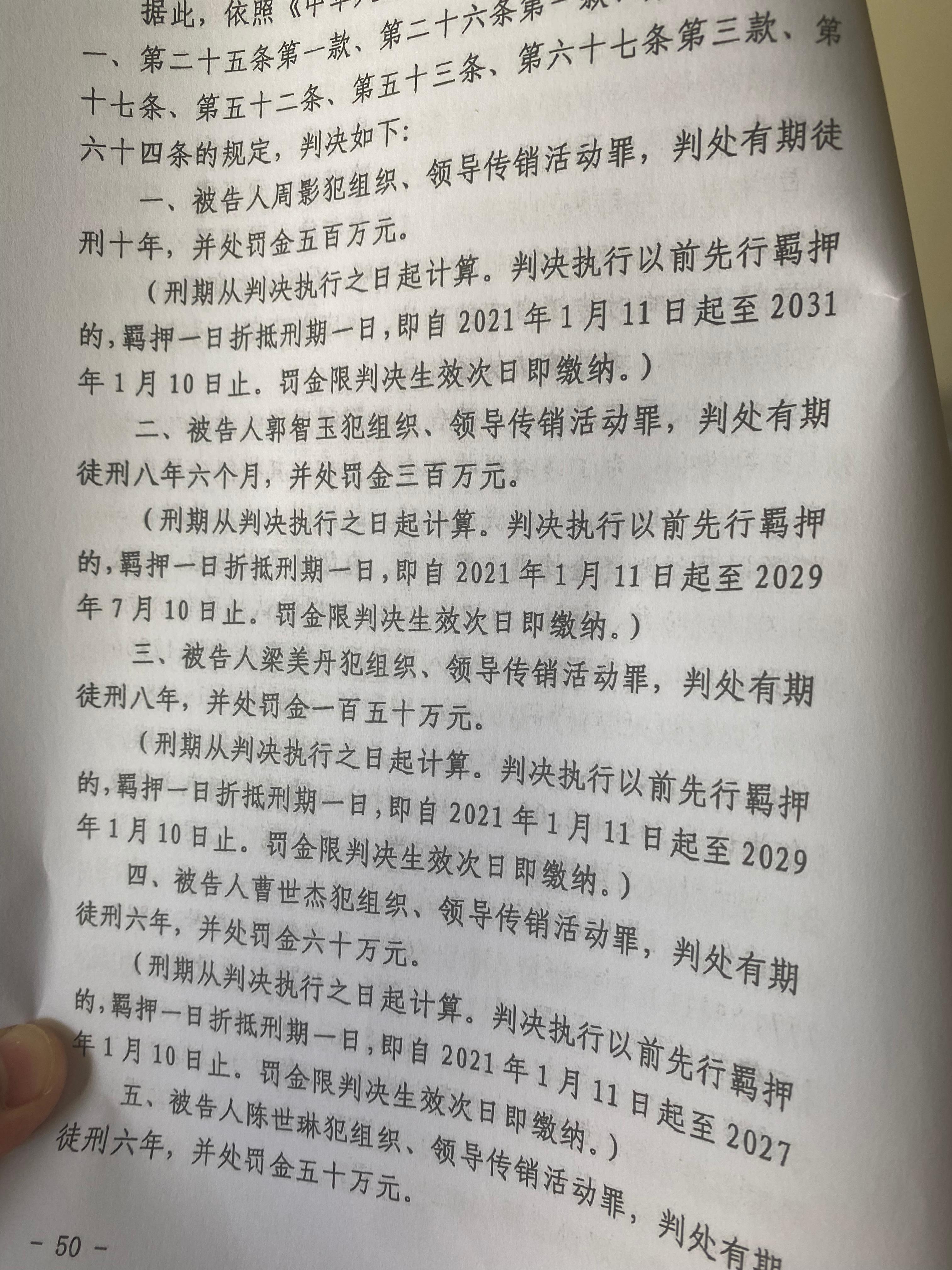 2023年10月10日,南岸区法院对此案作出一审判决,9名被告人全犯组织、领导传销活动罪,其中周影被判有期徒刑十年、处罚金500万元;郭智玉被判有期徒刑八年六个月、罚金300万元。
