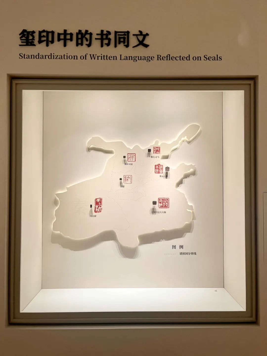 中国玺印通史陈列展品从西周贯通至中华民国。战国玺印形制丰富、功能多样。有赖于丰富馆藏以及印文作为官方代表文字的特性,创设“玺印中的书同文”专窗,使这一存在于史书中的制度得以物化呈现。