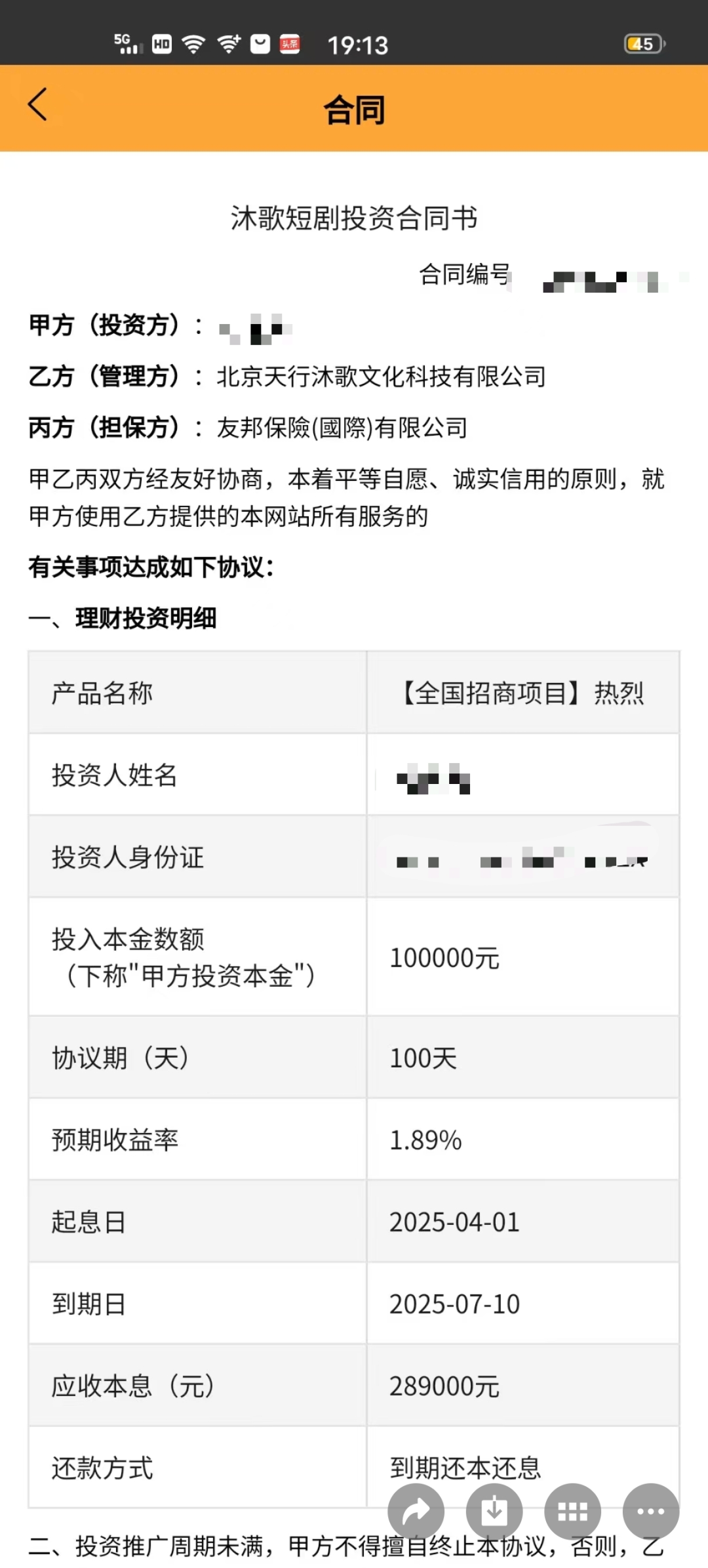 他称,在他转账后,平台有一份《沐歌短剧投资合同书》。该合同书显示,他妻子是投资方,“北京天行沐歌文化科技有限公司”为管理者。合同书载明,此次他投入的10万元,100天后的本息可以获得28.9万元。