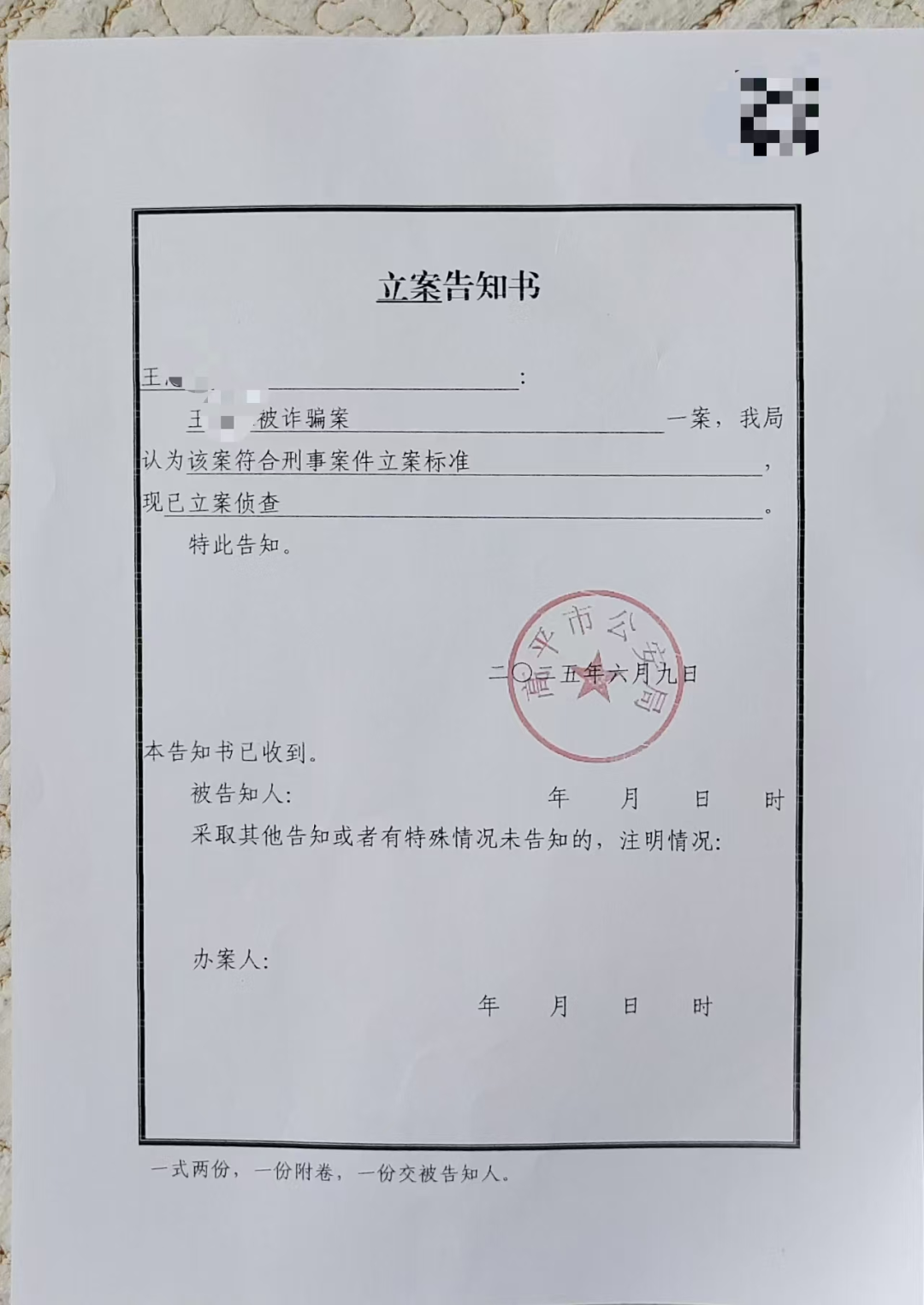 王先生提供的受案回执单显示,6月5日,关于他被诈骗案,高平市公安局已经受理。另一份“立案告知书”显示,该案件符合刑事案件立案标准,高平市公安局已立案侦查。该“立案告知书”的落款时间为6月9日,盖有“高平市公安局”的红章。