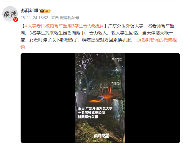 广东外语外贸大学一名老师驾车坠湖。3名学生找来救生圈丢向湖中,合力救人。救人学生回忆,当天体感大概十度,女老师脖子以下都湿透了,特意提醒对方回家换衣服。