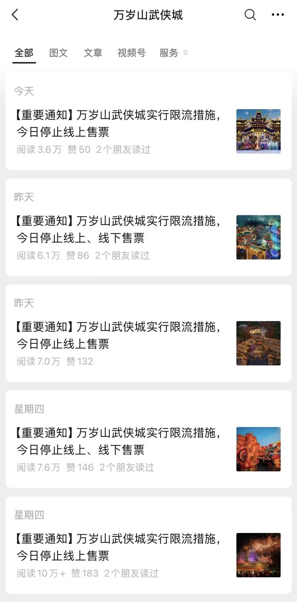 澎湃新闻搜索发现,万岁山武侠城已经连续3天发布实行限流措施并停止售票的通知。