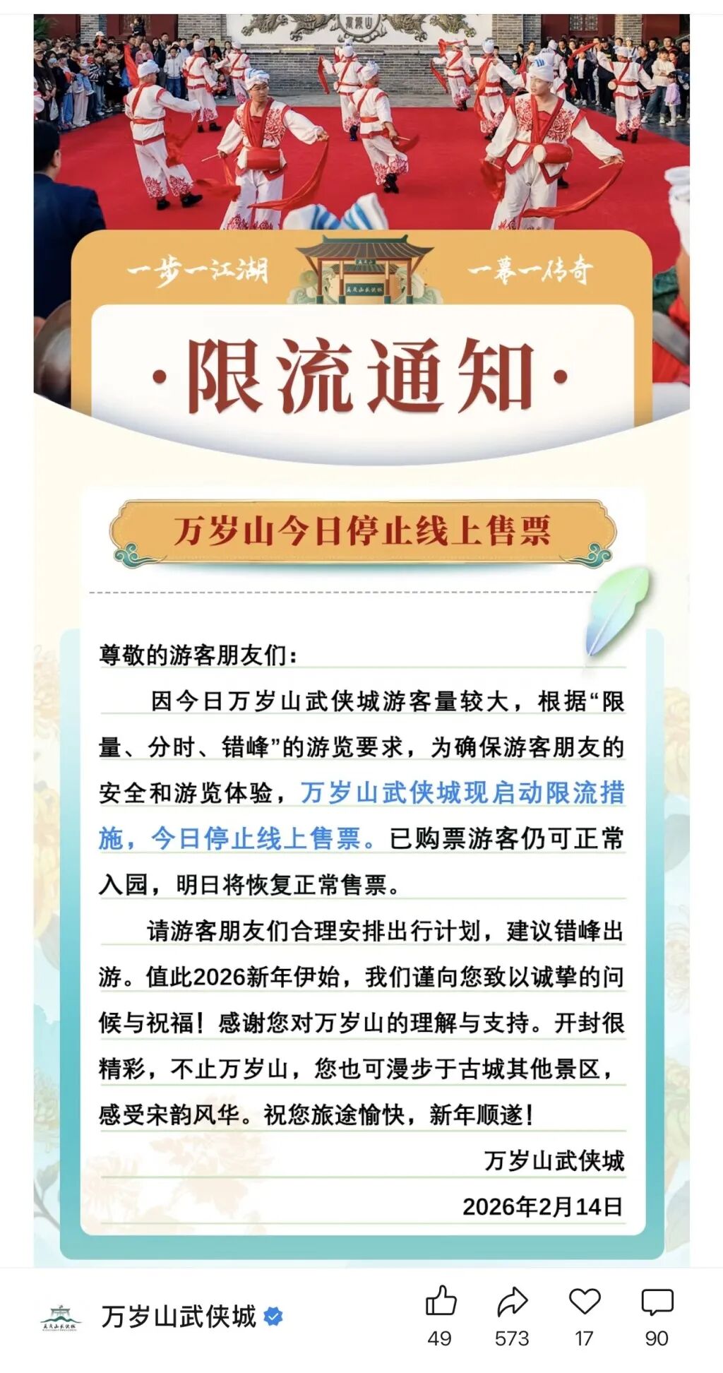 如当日14:10,万岁山武侠城发布通知称,因游客量较大,景区启动限流措施,当日停止线上售票。