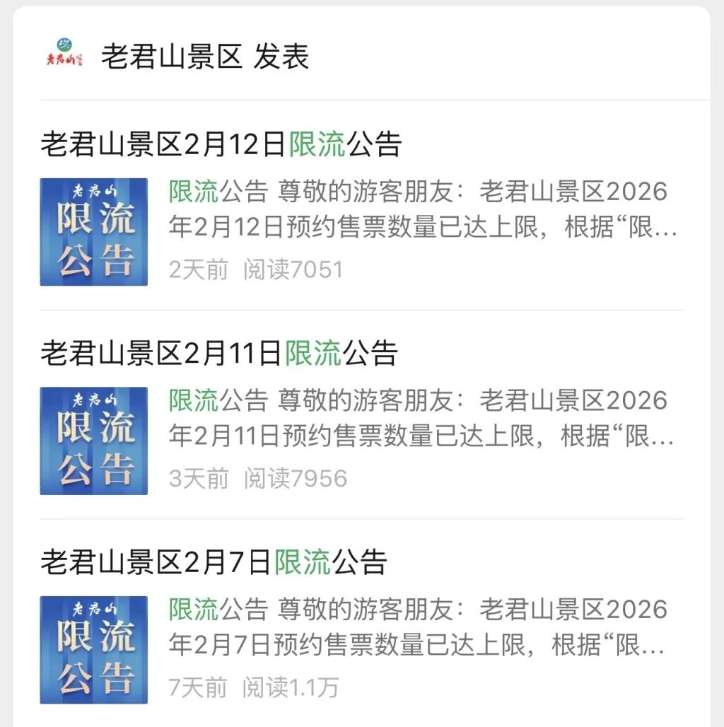 无独有偶,老君山景区2月7日、2月11日、2月12日也都发布了限流公告称,预约售票数量达上限,建议未成功预约购票的游客预约其他日期入园。