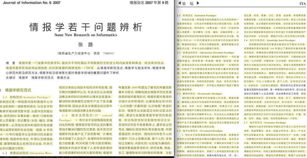 张路论文(左),涉嫌抄袭梁战平论文(右)的部分。如张路论文《情报学若干问题辨析》中1.5小节写道:认知范式(Cognitive Paradigm) 由于认知科学的发展,一些研究者开始从认知过程,如注意、知觉、表象、记忆、思维、语言等来观察信息和情报现象。认知范式强调人的知识结构、研究人的信息处理原理、关注情报的利用和吸收、目的是支持和改善情报系统的设计和情报服务。认知观的变迁意味着情报学研究主体从情报检索系统的设计和开发扩大到强调情报用户的知识结构、认知过程、情报行为和人机交互等认知范围。
