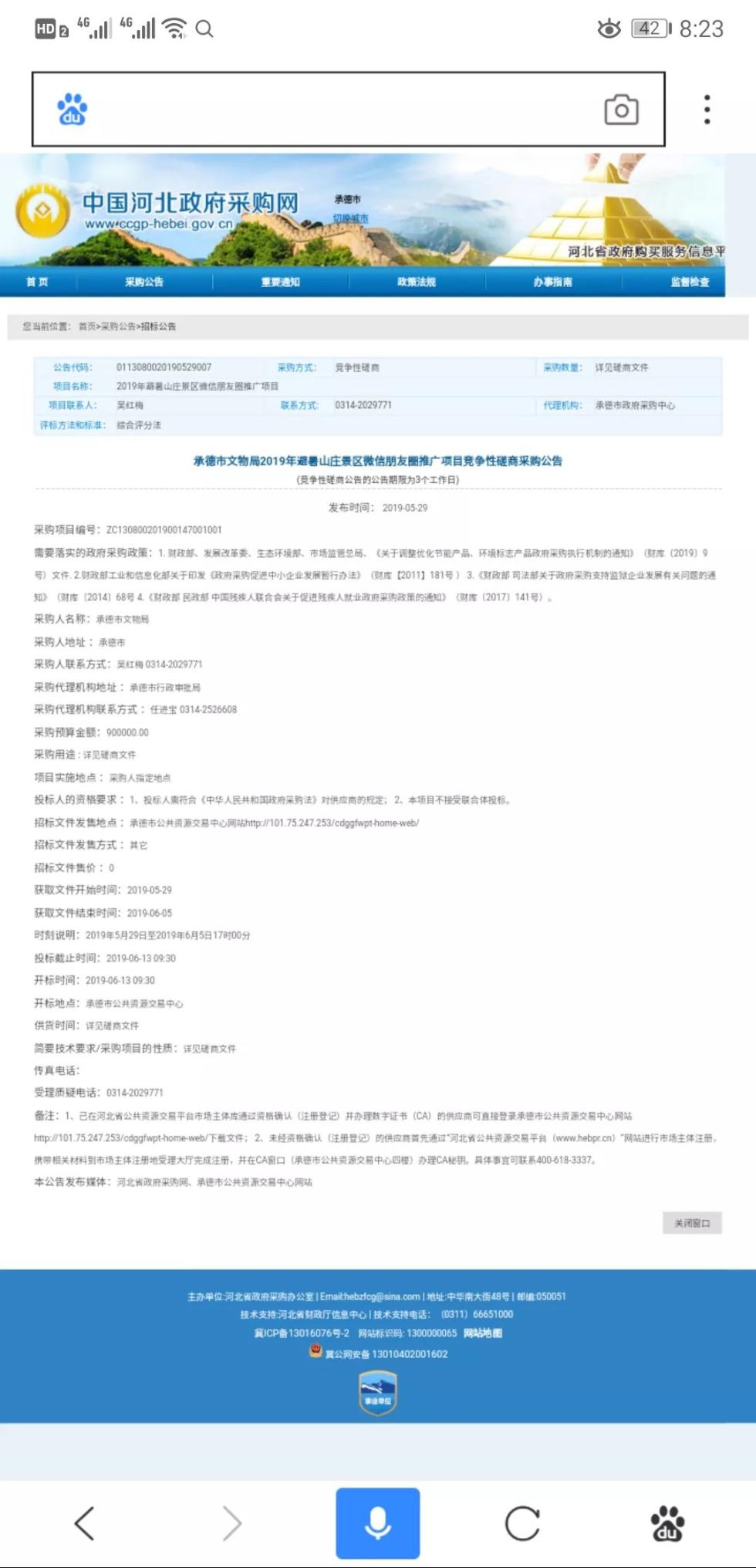 澎湃新闻记者18日根据上述网民提供的线索查询发现,中国河北政府采购网在今年5月公布了一份《承德市文物局2019年避暑山庄景区微信朋友圈推广项目竞争性磋商采购公告》,显示承德市文物局对“2019年避暑山庄景区微信朋友圈推广项目”进行招标,采购预算金额为“90万元”。