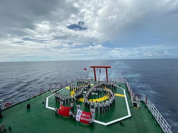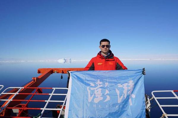 11月21日晚,科考船雪龙号距南极中山站约20公里。当地时间20日晚,第36次考察队临时党委乘坐直升机来到中山站进行慰问,为留守中山站的越冬考察队员带了新鲜蔬菜和水果,并听取中山站越冬人员的工作汇报。图为澎湃新闻记者与澎湃蓝旗在“雪龙”号上合影。澎湃新闻南极科考特派记者 何锴 图