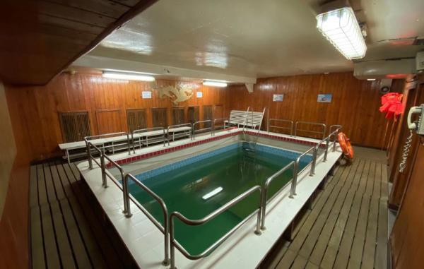 “雪龙”号最热门泳池,用的是加热的海水。澎湃新闻南极科考特派记者 何锴 图考察队副领队魏福海,他已经是第10次来南极执行考察任务了;直升机组的刘晓平,他基本是每隔一年就来一次南极。安全督导员吴林则是今年船上唯一一名参加过首次南极科考的元老队员,至今已参加22次南极考察。30多年来,吴林在南极待过的时间甚至比在家里待的时间还长。