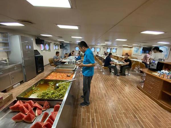 “雪龙”号上的食堂,科考队员正在用餐。澎湃新闻南极科考特派记者 何锴 图没有手机的聚会,老科考队员成为了谈话的主角。