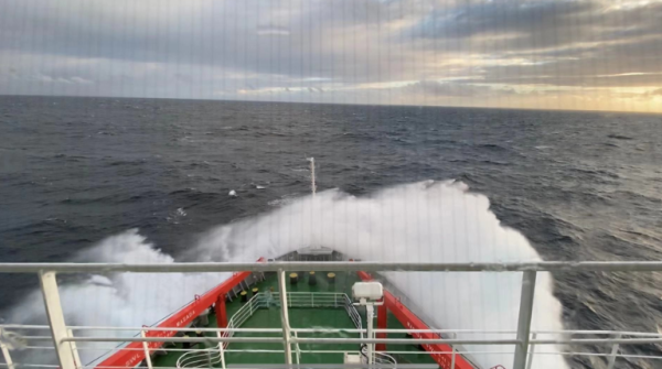 由于西风带的风向和涌浪的方向不停变化,船身的摇晃变得越来越没有规律,时而横向摇摆,时而船头向下纵向颠簸,船身最大横摇角度达到18-19度。