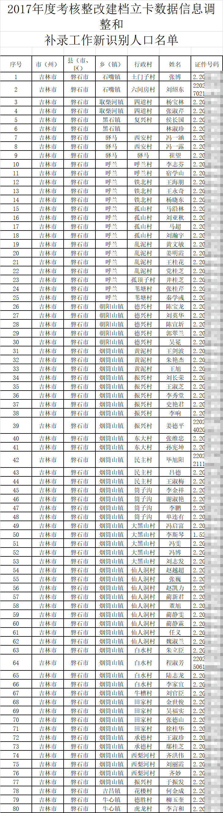 《磐石市2017年考核整改建档立卡数据信息调整和补录工作新识别贫困户名单公示》其中附有一份名单。