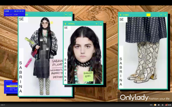 而最终部“终曲”系列发布以独特视觉敍事呈现了崭新的风貌。Alessandro Michele以复古的电子屏幕与音效来进行系列LOOK的展示,虽然没有了以往T台模特动感的步伐,却通过多屏投放来对造型进行放大与多视角的展示,仿佛观众正在点击页面,进行自主“选购”。
