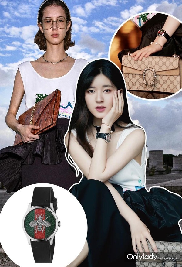 赵露思穿着Gucci 2020早秋系列饰Gucci Hawaii字样背心,荷叶边细节黑色半裙,黑色凉鞋,搭配Dionysus系列GG肩背包,方形G漆皮蝴蝶结颈圈,又甜又可爱。