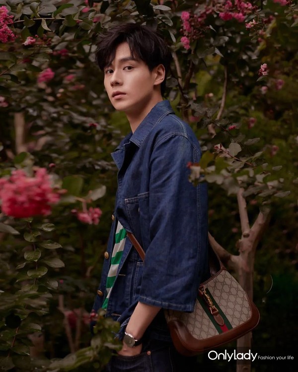 胡一天穿着Gucci 2020早秋系列深蓝色牛仔夹克,小猪贴饰条纹T恤,活力十足的少年感扑面而来。