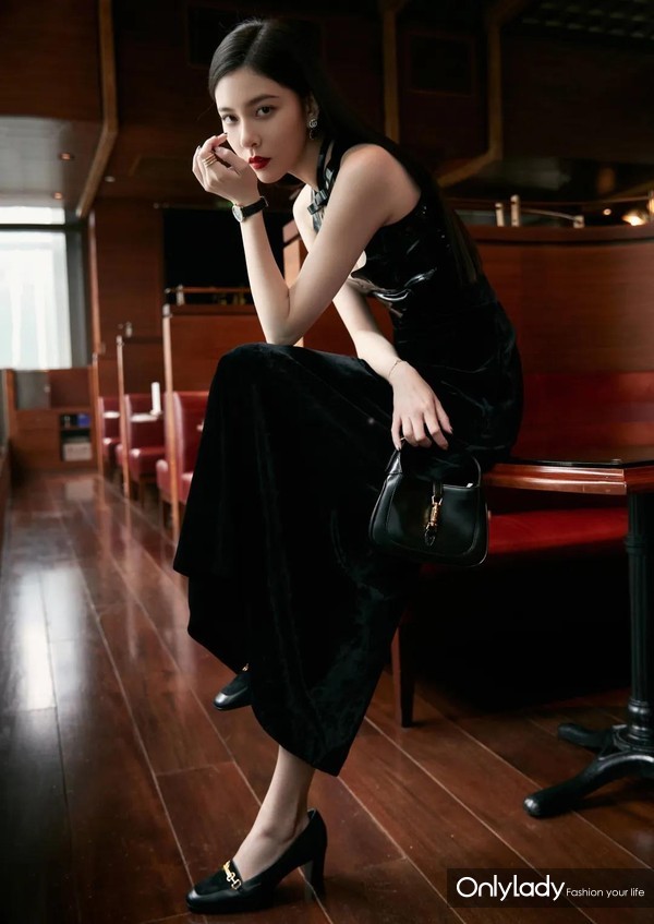 宋妍霏穿着Gucci 2020早秋系列饰蝴蝶结细节黑色长款连衣裙,饰马衔扣黑色中跟莫卡辛鞋,搭配Jackie 1961系列黑色迷你手袋,优雅中自有纯洁美好。