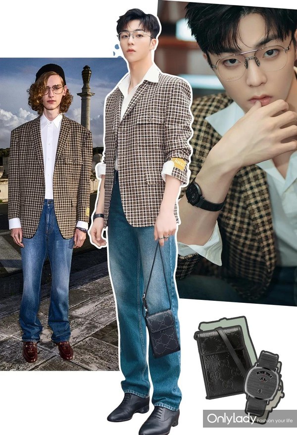陈立农上身Gucci 2020早秋系列深棕色格纹夹克,搭配白衬衫与半框眼镜,轻熟气质迷人;包袋与配饰的选择也充满魅力,GG印花压纹迷你肩背包、Gucci Grip系列腕表、GG Marmont系列戒指,温文尔雅的高级感谁会不喜欢呢?