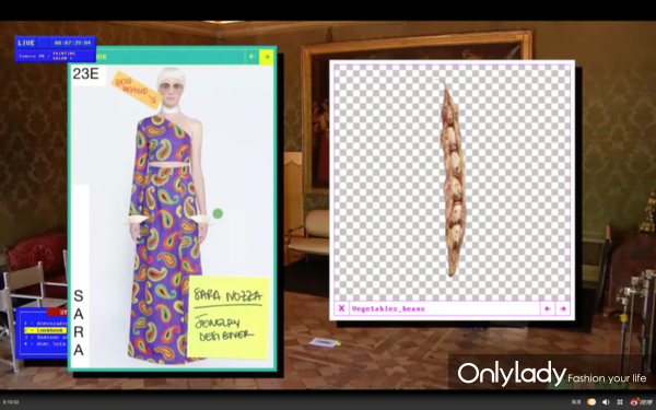 自然界的灵感,在本次系列被加以妙用。look旁会附着相关的瓜果蔬菜,可以看到颜色选取便来源于此,正好呼应了秀场前的邀请函就是一篮果蔬,时尚源于生活,又作用于生活。