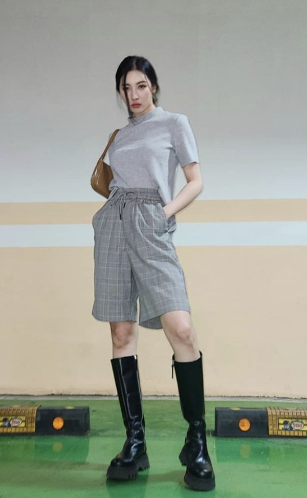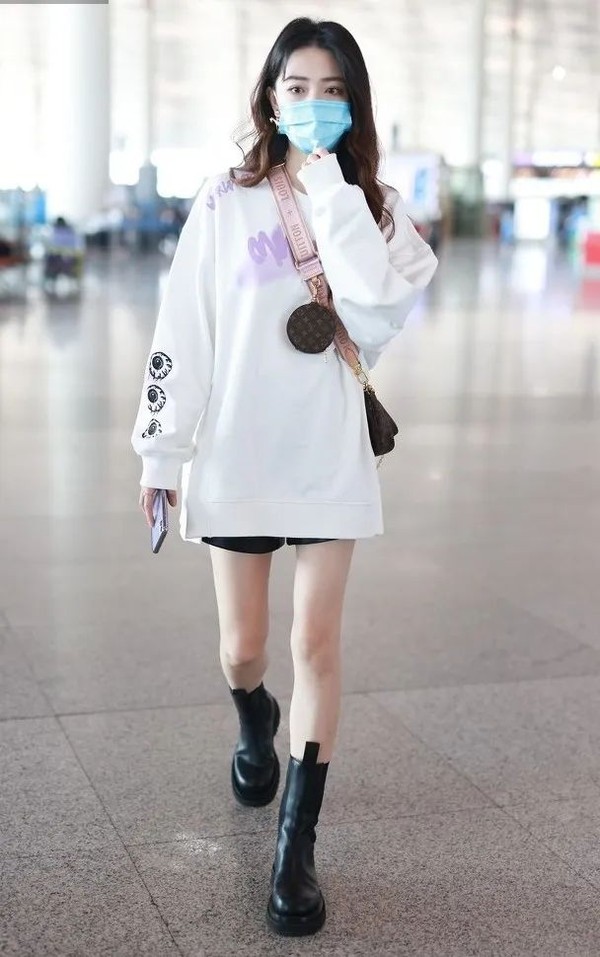 宋妍霏用下衣失踪的方式搭配及膝靴,腿显得又细又直,也正好适合初秋的温度。