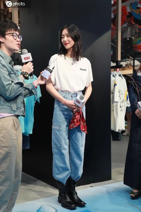 在出席活动时,刘雯把宽松的牛仔裤扎进短靴里,搭配简单的白t,干练又不失气场。