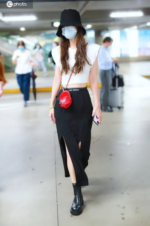 像Angelababy一样搭配高腰开衩长裙,让腿部线条若隐若现,既能增加气场,也不会暴露腿型的缺点。