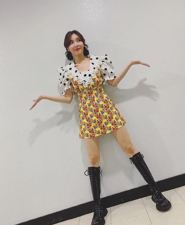 除了打歌舞台,泫雅的私服也常常宠幸牛仔靴。碎花小短裙搭上略显粗犷的靴形,既甜美又野性。