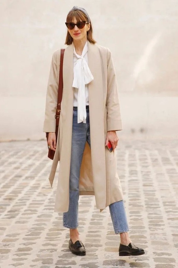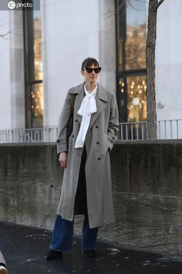 灰色风衣搭上香槟色短巧系带衬衣,绸缎面料增加整体的光泽度,精神和贵气一下就来了,风衣的纽扣颜色与香槟色衬衣呼应,下装再搭上白色一字裙,又提高了整体的明度,活脱脱北上广精致都市丽人打扮。