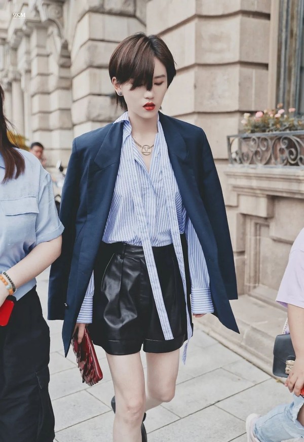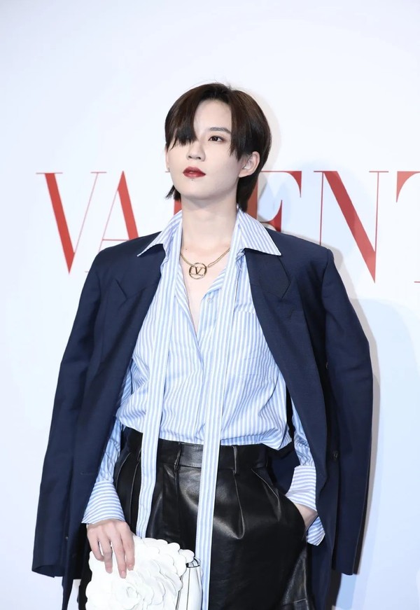 前段时间陆柯燃出席时尚活动,开领海魂飘带衬衣加上披肩西装,黑色皮裤酷劲更足。