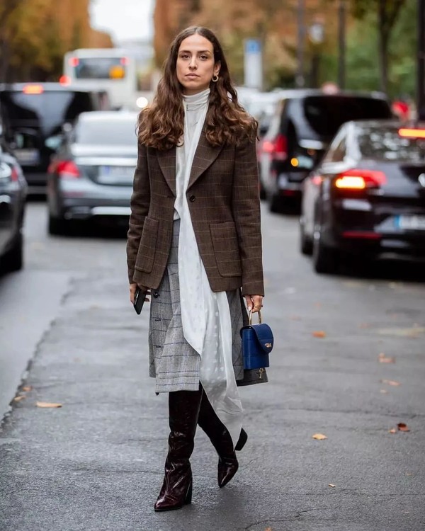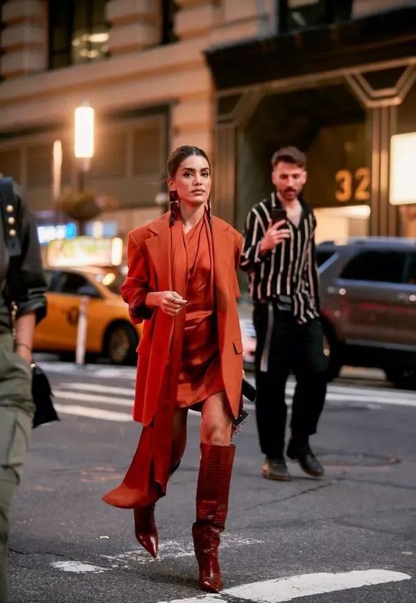 如果你认为驼色系稍显沉闷的话还可以选择饱和度更高脏橘色系,颜色也非常秋冬且亮眼,搭配同色系筒靴,金色耳饰,马上就要去参加名流晚宴了。