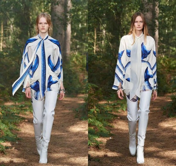 前不久刚从秀场上下来的Burberry就给大家带来了最新的两款飘带衬衣,雪纺纱轻盈的材呼应蓝色鲸鱼鱼尾印花,飘动起来就如鲸鱼在深海潺动,浪漫至极。