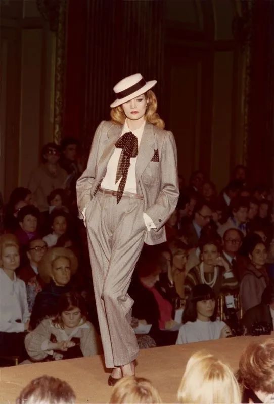 而到了70年代,Yves Saint Laurent 的“吸烟装”横空出世,女性力量达到一个高潮,女性穿着宽肩西装像男人一般大步走路,西装不再是男性的专属,西装与蝴蝶领巾的组合是那个时代最时髦最有态度的穿着。